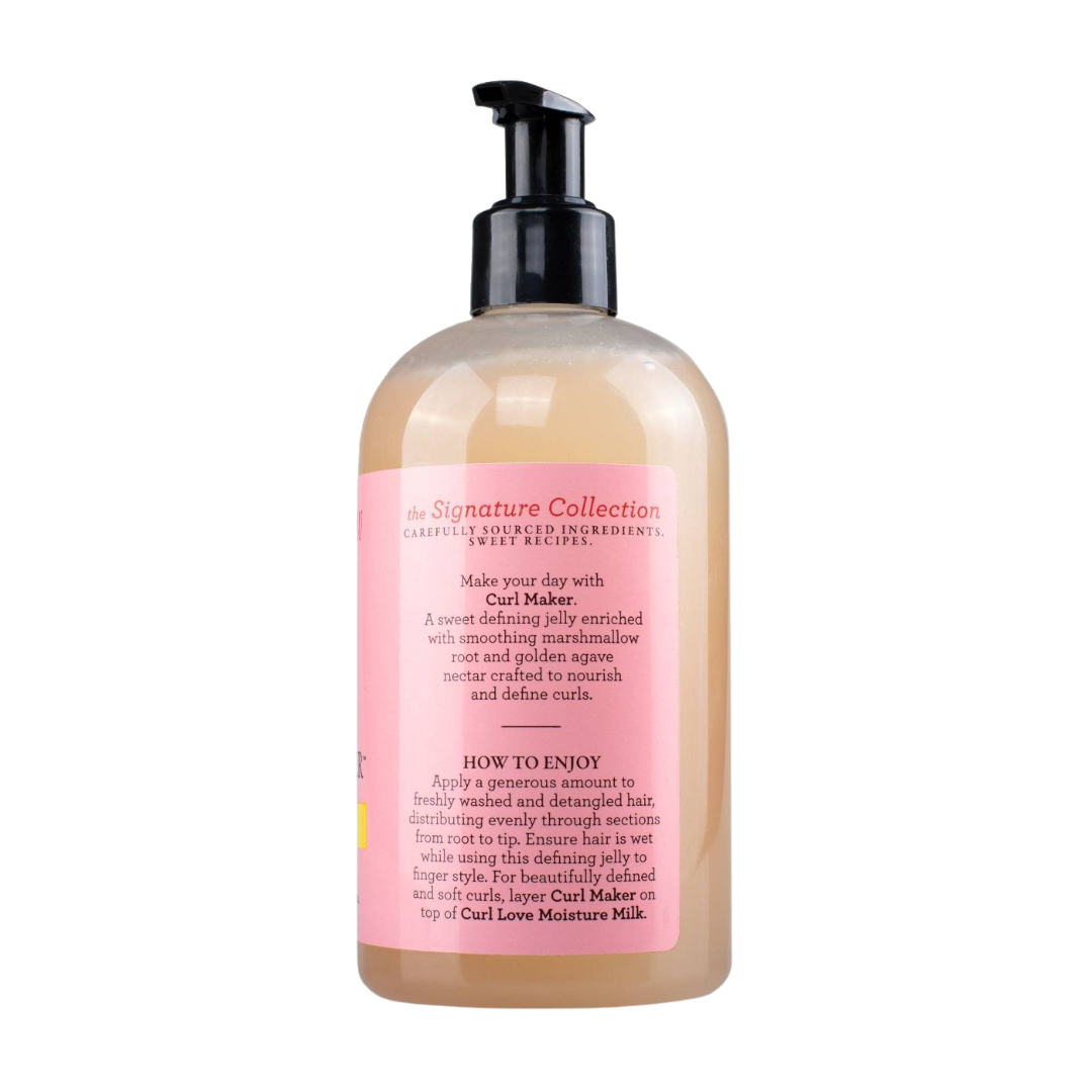 Apply a generous amount to freshly washed and detangled hair, distributing evenly through sections from root to tip. Ensure hair is wet while using this defining jelly to finger style. For beautifully defined and soft curls, layer Curl Maker on top of Curl Love Moisture Milk.