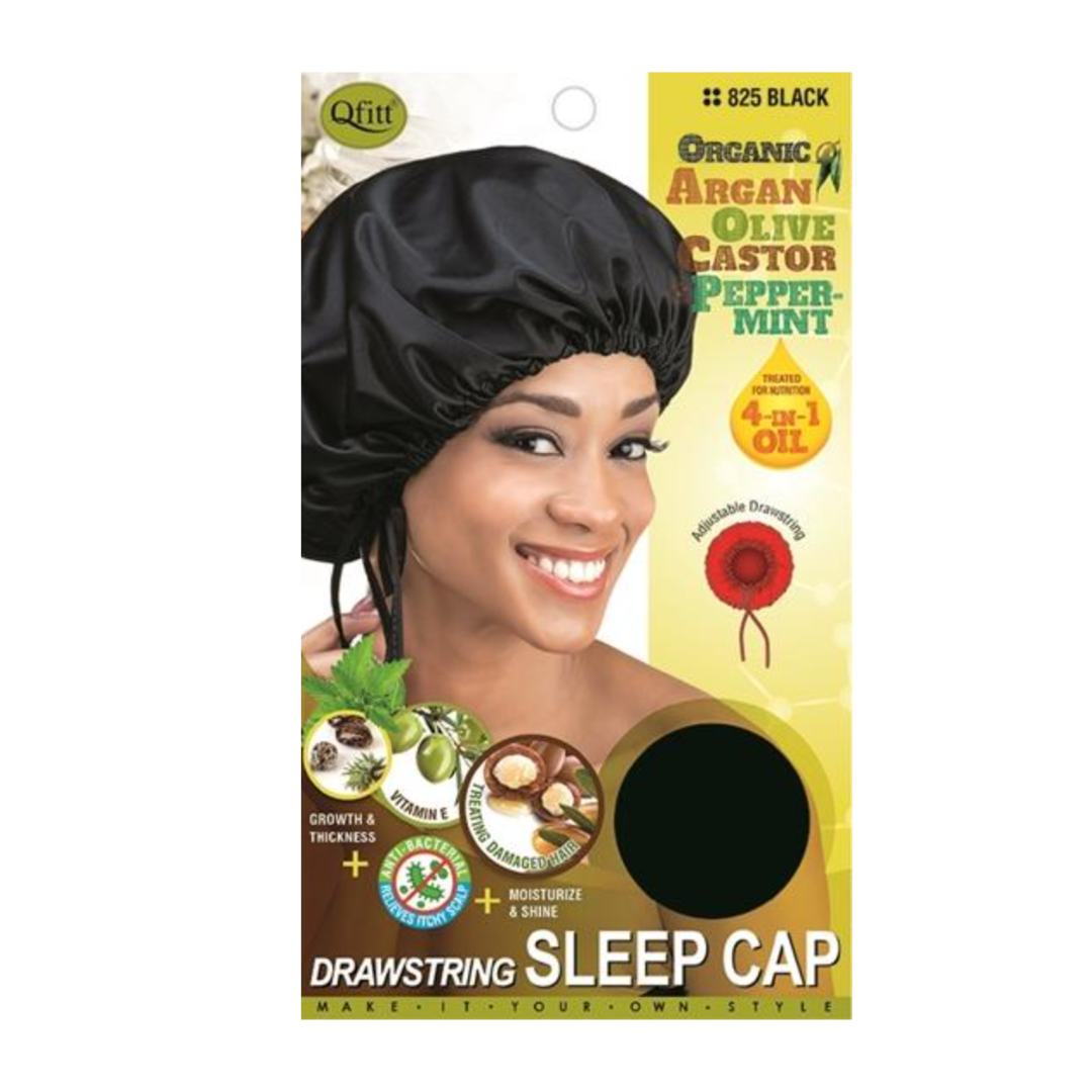 Qfitt Premium Drawstring Sleep Cap 4-in-1 Oil Treatment Bonnet is treated with Organic Argan Oil Olive Oil, Castor Oil & Peppermint Oil to make it the perfect bonnet.