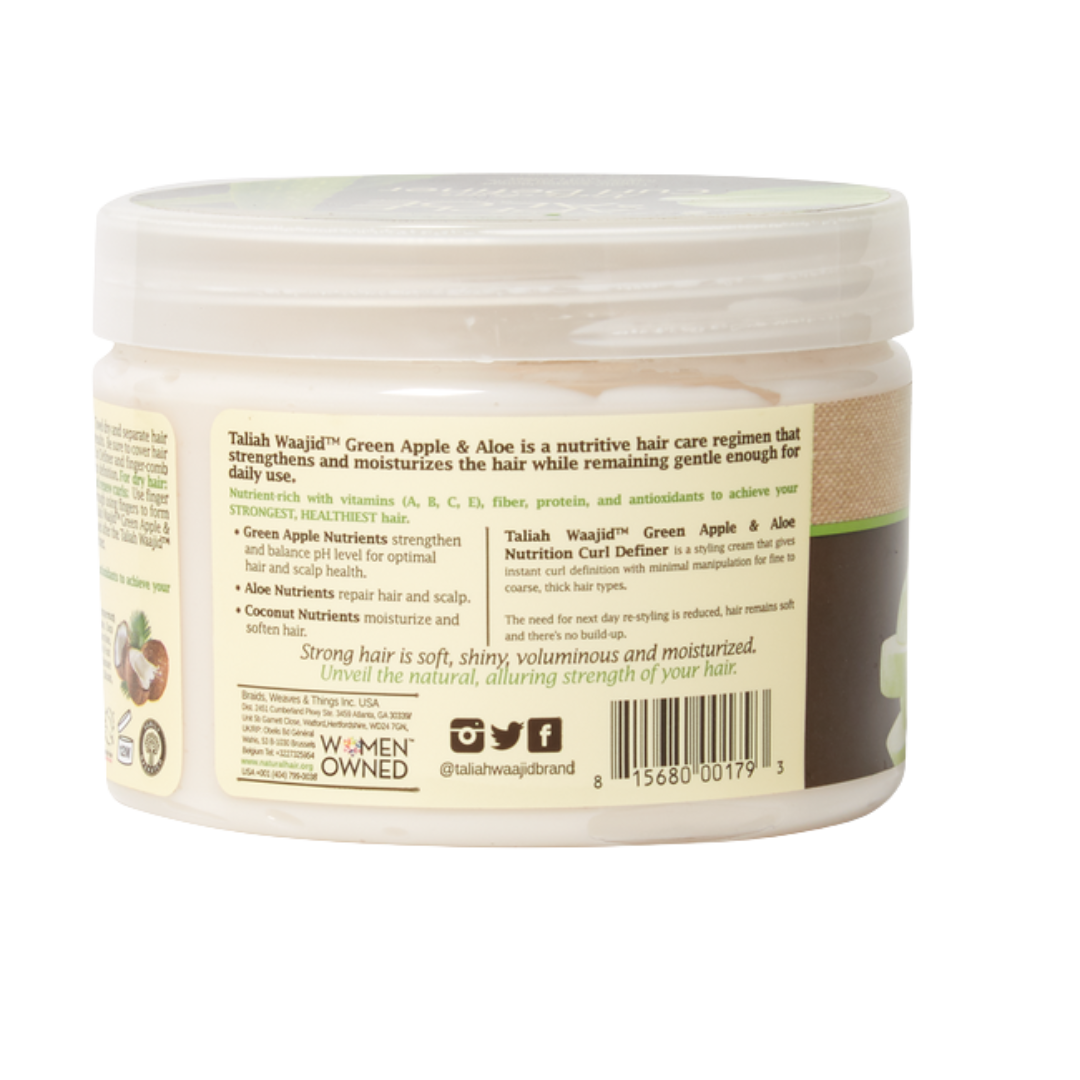 Taliah Waajid™ Green Apple & Aloe Nutrition Curl Definer is a nutritive hair care regimen that strengthens and moisturizes the hair while remaining gentle enough for daily use.