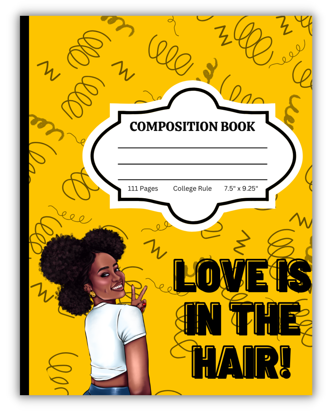 Love Is In The Hair Composition Notebook. Perfect for school, college, work or personal use. Keep organized and tidy with this 111 paged cute illustrated notebook. Use for note-taking, as a diary or journal. The ideal gift for the student in your life, someone special or for those who need to be more organized.