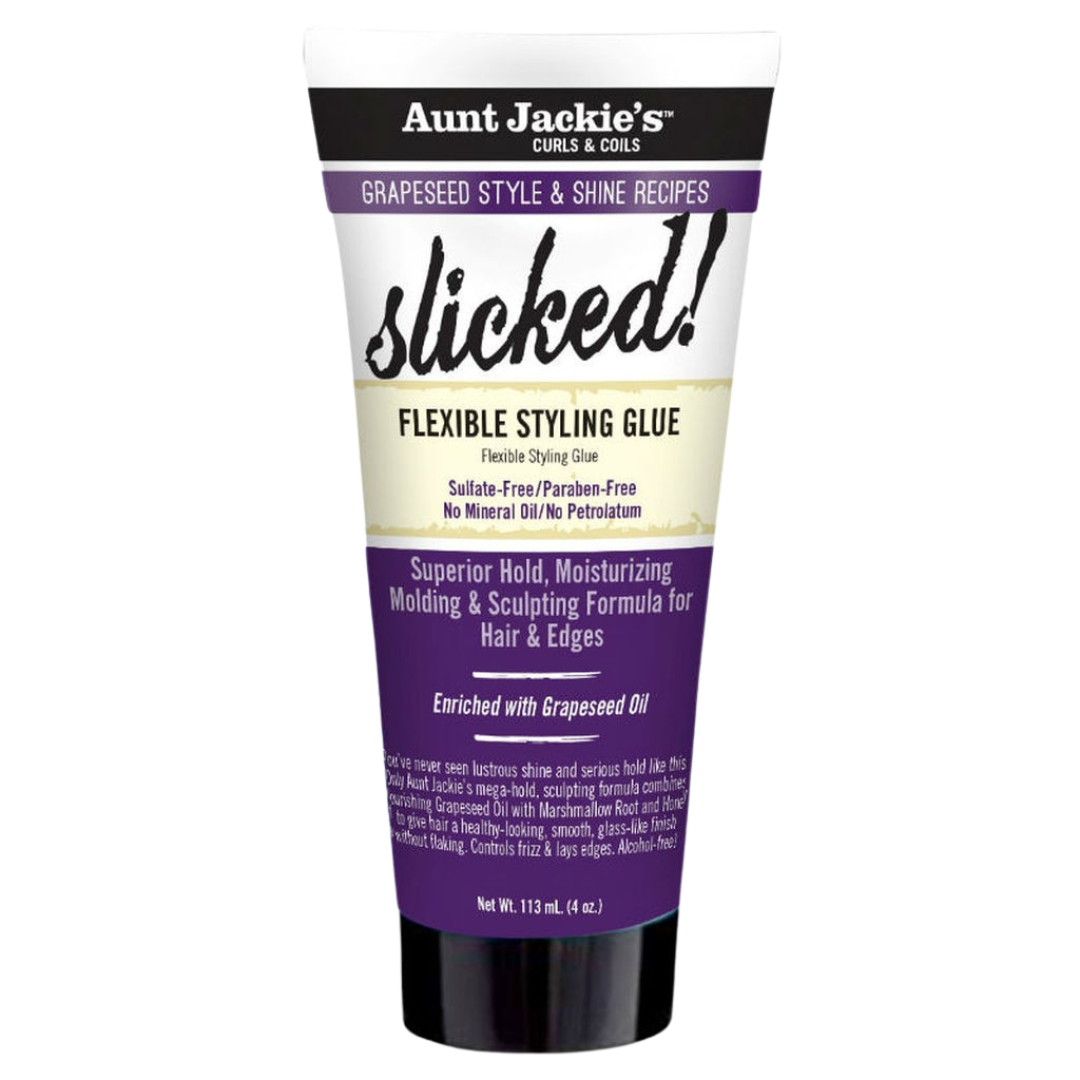 Slick it, smooth it, sculpt it, spike it, slay it. Slicked! is the ultimate styler, taming the most stubborn hair. Great for sleek styles, like ponytails & puffs or for sculpting edges, this gel delivers superior hold. Unlike some other holding gels that flake and zap moisture, Aunt Jackie’s Grapeseed gel is infused with Marshmallow Root & Honey to add moisture, shine, and help protect hair and hairline from breakage. A little goes a long way. Great for use on all hair types and textures.