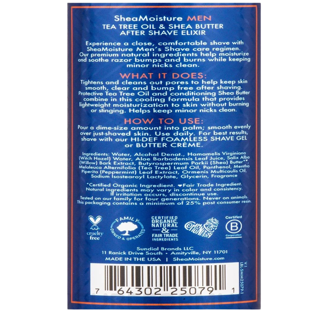 Experience a close, comfortable shave with SheaMoisture Men's Shave care regimen. Tea Tree Oil for razor bumps is a reliable natural solution for an age-old skin problem that many men struggle to overcome. Our premium natural ingredients help moisturize and soothe razor bumps and burns while keeping minor nicks clean. The Tea Tree Oil & Shea Butter After Shave Elixir tightens and cleans out pores to help keep skin smooth, clear and bump-free after shaving.